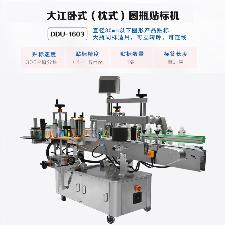 DDU-1603 立式圓瓶定位貼標機 適用范圍:用途廣泛!主要適用于醫(yī)藥、日化、食品等行業(yè)的圓柱形包裝容器或小錐度的圓錐形包裝容器的單標、雙標自動定位貼標.該機拓展性強!可選配各類打印機完成在線實時打印,可單機使用,亦能連接生產(chǎn)線使用 主要性能結構特點:1、中英文觸…